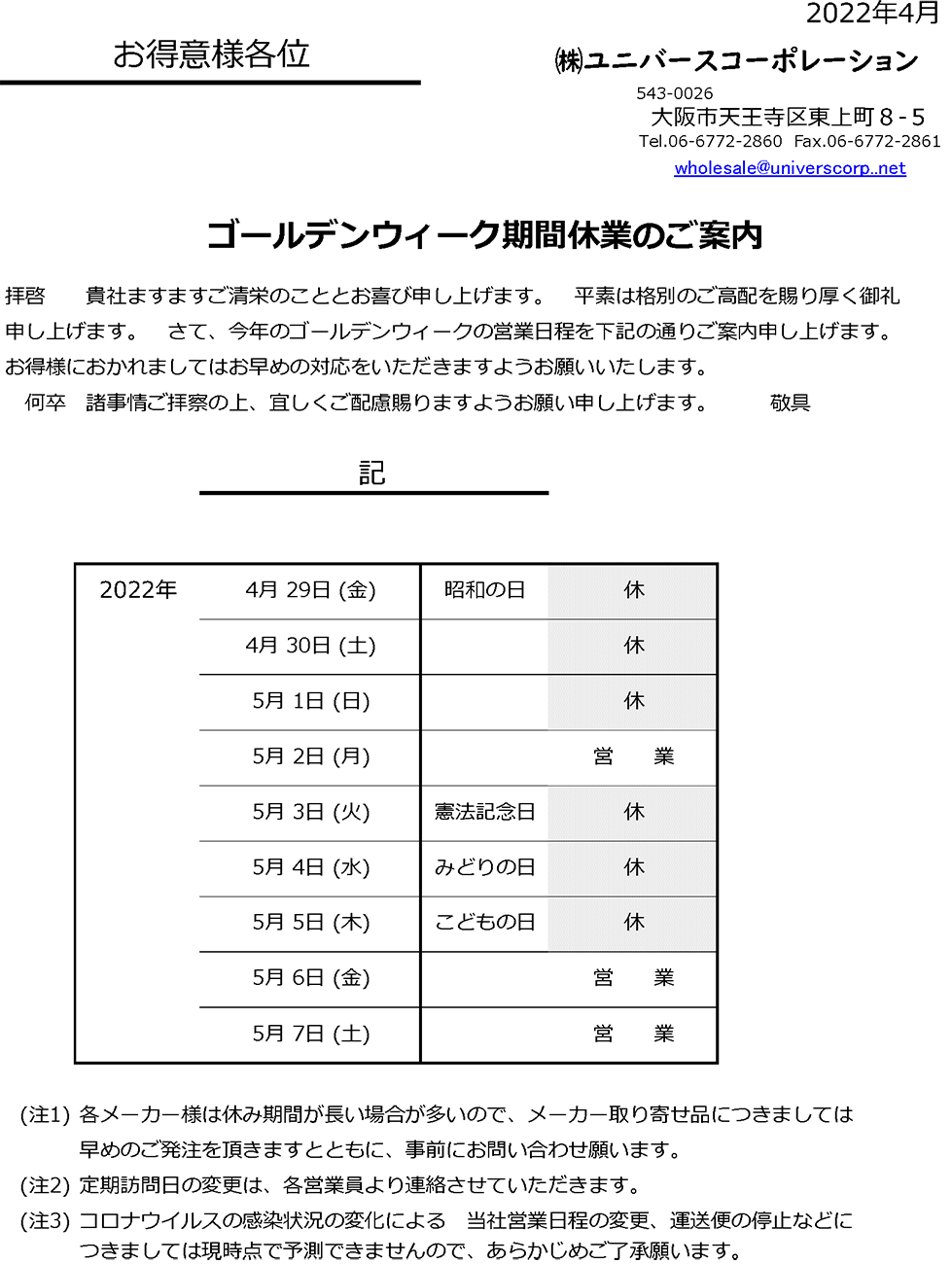 GW休業日のご案内
